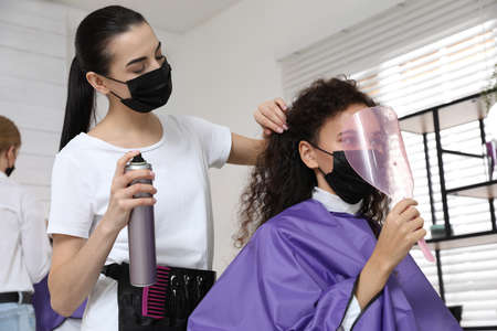 Professional stylist working with client in salon. Hairdressing services during quarantine