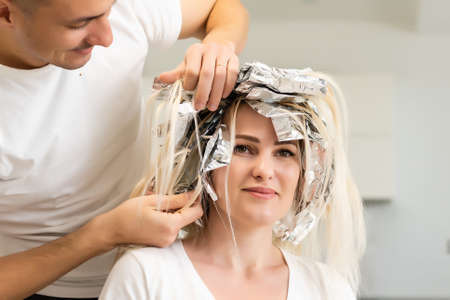Smiling stylist is dying long hair, man hairdresser dyes hair woman