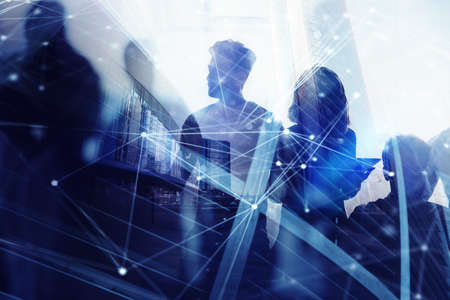 Silhouette of business people work together in office. Concept of teamwork and partnership. double exposure with network effects
