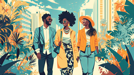 Three stylish friends walking joyfully in an urban cityscape amid vibrant colors.