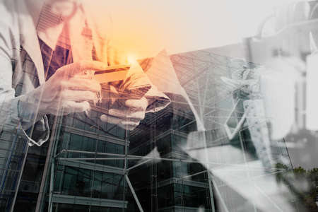 double exposure of hipster hand using smart phone,digital tablet docking keyboard,holding credit card payments online business,sitting on sofa in living room,work at home,London architecture city