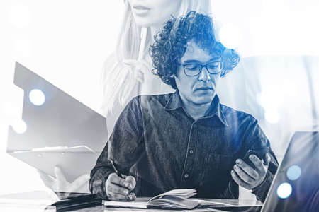 Startup concept with double exposure diagrams blurred background.