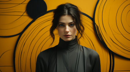 A captivating portrait of a fashion-forward girl in a black shirt, her striking pose against a yellow wall evoking a sense of rebelliousness and bold individuality