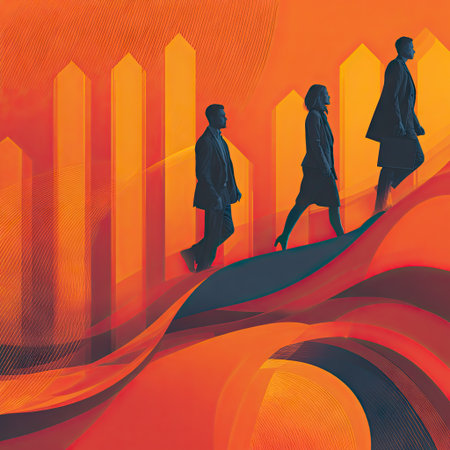 This vibrant stock image captures the essence of modern business growth, showcasing professionals amidst geometric shapes and dynamic colors, ideal for conveying success.