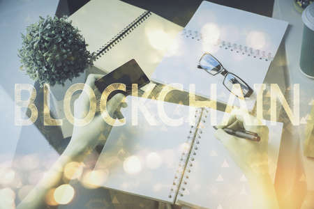Blockchain technology concept with a chain of encrypted blocks.businessman working with laptop computer with fintech, financial cryptocurrency such as bitcoin