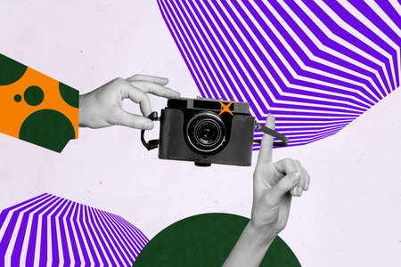Composite sketch image design trend artwork collage of two hand hold camera paparazzi shot photo journalist moment idea creative picture