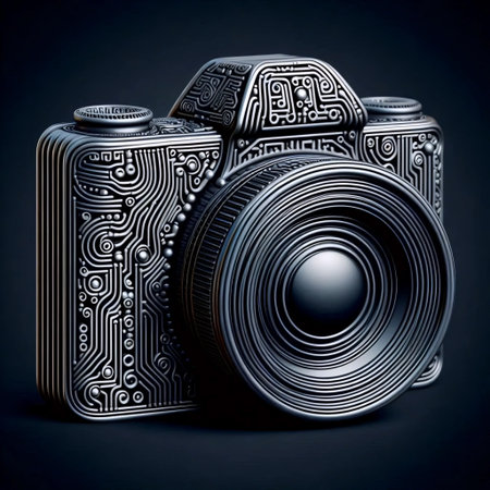3D illustration of Digital DSLR camera made from steel (metal). Composition with lot of lens flares. Copyspace on the right.