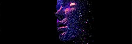 A striking digital artwork showcases a face emerging from a sea of colorful cosmic particles against a dark backdrop, creating a captivating visual experience.