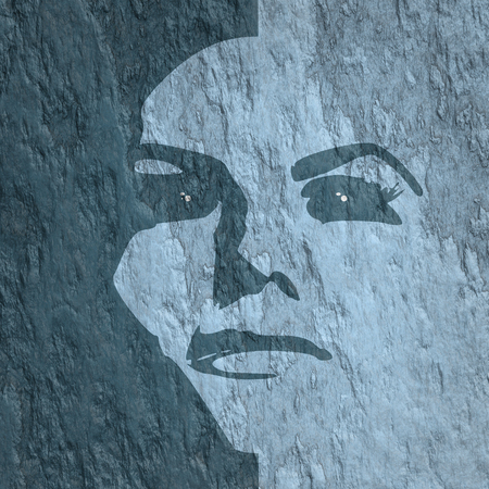 Close-up young mans face, head with colored silhouette, shadow isolated on light background. Human emotion, split personality, mental problems concept.
