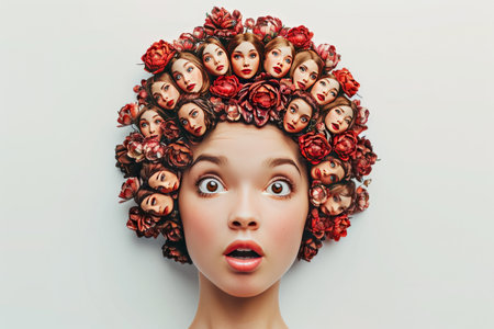 A young woman stars intently at the viewer, her face adorned with small photographs, creating a collage that reflects various moments.