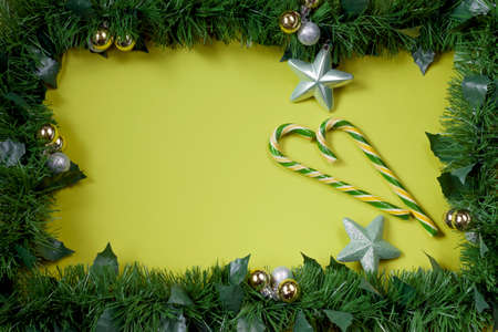 Creative frame mock up from branches of a Christmas tree, New Year's toys and candy cane on a green background. Christmas and New Year theme. Flat lay, top view, wide composition. Copy space