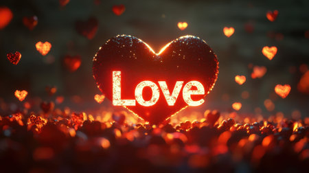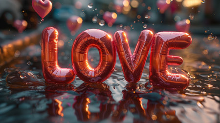 A creative 3D rendering of the word LOVE in gold letters surrounded by floating red and pink hearts on a dark background, conveying a sense of romance and affection.