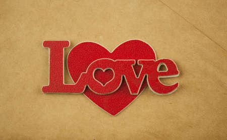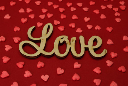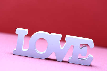 Valentine day love concept. Word love made from wooden letters on red paper background