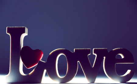 Wooden word love with heart romance. Hard shadows Minimal concept of greeting card for Valentines Day, Mothers Day, Womens Day Festive banner holiday card concept. Wedding decor.