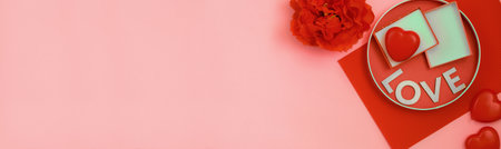 Banner. The word love is laid out in wooden letters with a red heart on a gold background. The concept of a Valentines day greeting, for a wedding.