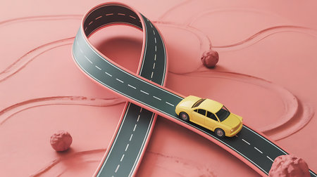 A yellow car drives on a road shaped like a pink ribbon, symbolizing the journey of breast cancer