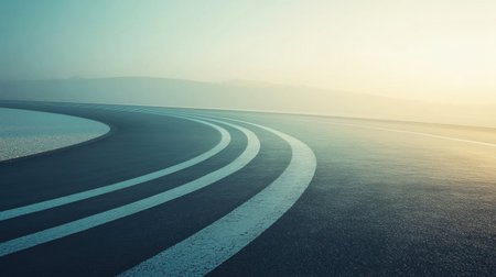 A close-up of a winding road's textured asphalt surface bathed in gentle dawn light, highlighting the smooth curves and layered lane markings with subtle shadows.
