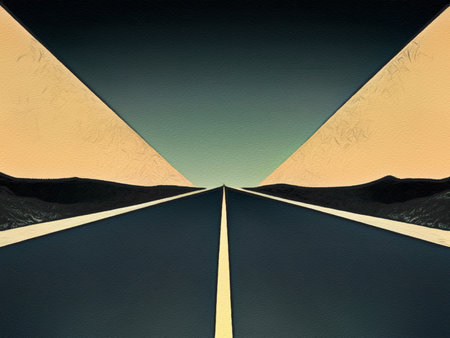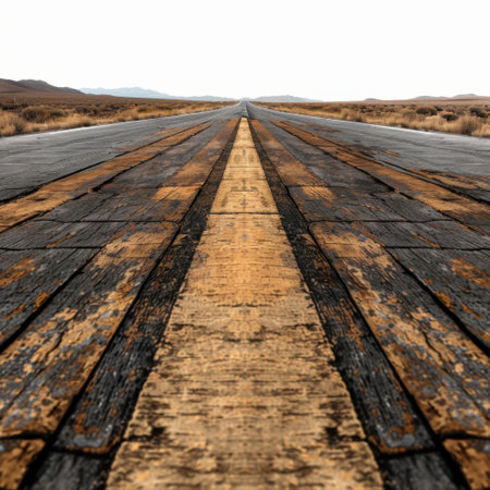 An expansive empty road stretches through a desert landscape, featuring a unique wooden texture. The bright sky and distant mountains create a serene atmosphere, inviting exploration.