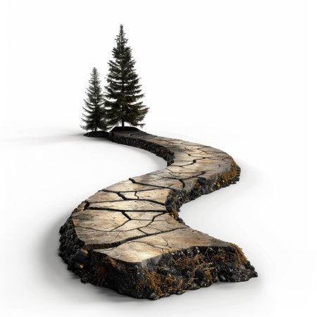 This captivating image features a cracked pathway winding between two spruce trees, highlighting themes of nature and transformation in an abstract landscape.