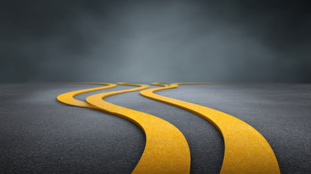 A captivating image of a winding road with bright yellow lines against a dark, cloudy sky. This dramatic and moody setting evokes themes of adventure and freedom.