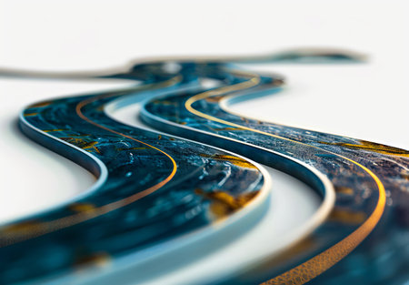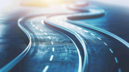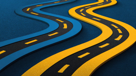 Dynamic abstract image featuring winding road designs in blue and yellow colors. The visual creates an engaging flow, perfect for modern design projects or transportation themes.