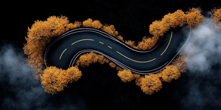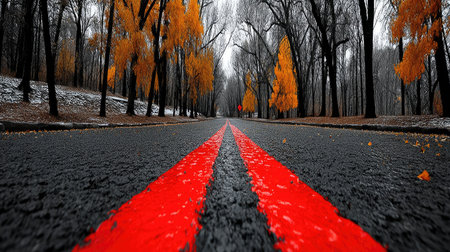 This image showcases a winding road adorned with brilliant autumn foliage, enveloped in soft mist. The striking contrast between the asphalt and vibrant leaves creates a captivating visual perfect for themes of travel and nature.