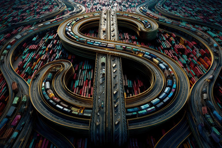 maze of twisted international roads and shipping lanes forming the shape of a dollar sign, with cargo stuck mid-way, abstract concept of import duties tax illustration