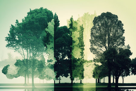 Trees, the green lungs of a city, in double exposure on a white background