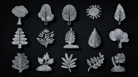 Hand-drawn tree and plant icons displayed on a black background highlight artistry and natures beauty, capturing various shapes and designs creatively.