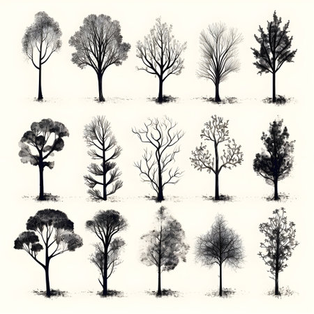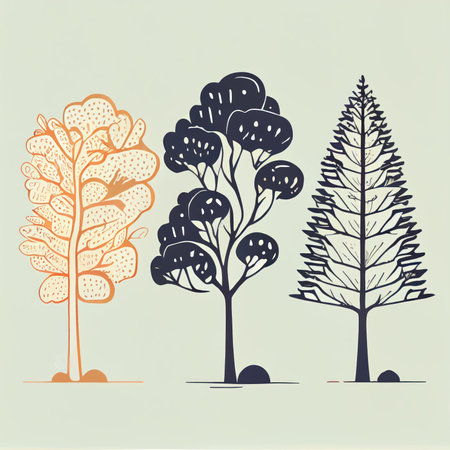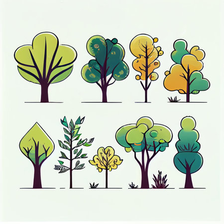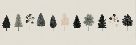 A beautiful collection of illustrated trees featuring various shapes and textures lined up against a neutral background, emphasizing natural beauty.