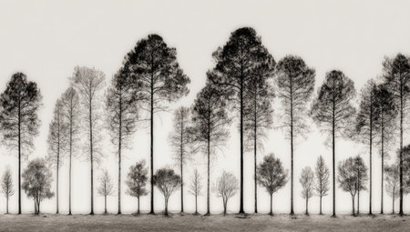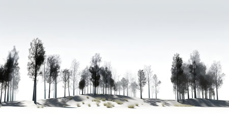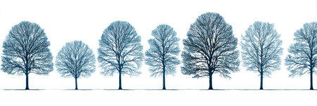 A row of naked trees stands against a bright white background, illustrating seasonal change and the serene beauty of nature in wintertime.