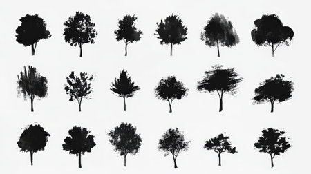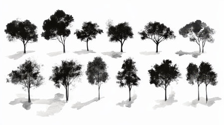 Set of trees silhouettes isolated on white background generative Ai. tree object white background design plant black collection natural. trees silhouette art leaf outline graphic trunk stem summer.