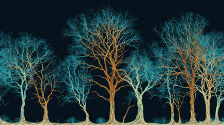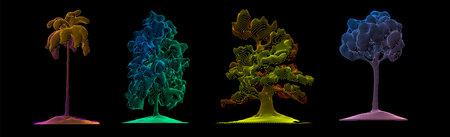 Ethereal trees with striking, intricate branches and roots are displayed against a dark background, showcasing a unique blend of colors and an artistic interpretation of natures beauty.