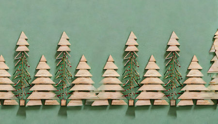 illustration of wooden christmas trees toy aligned in nice lines against pastel green background generative ai