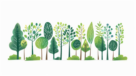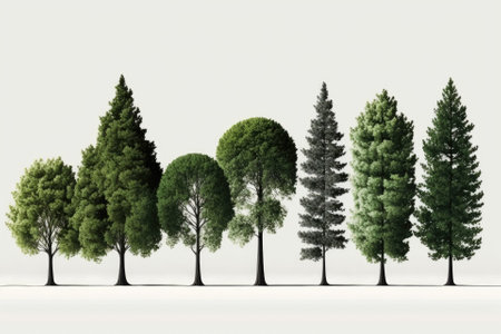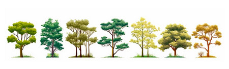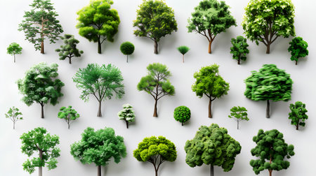 A diverse collection of green trees and plants displayed against a white background, showcasing the richness and variety of nature.