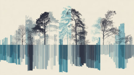 Serene landscape featuring stylized trees in various shades of blue and gray, creating harmonious blend of nature and abstract art. composition evokes sense of tranquility and reflection
