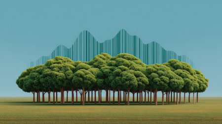 A row of trees forming a barcode, visual metaphor for nature being consumed and the need for conservation with space