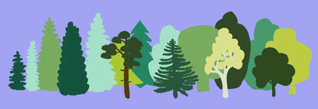 Trees in the forest, border decoration. Wood plants, stylized forest panorama. Flat modern illustration isolated on white..