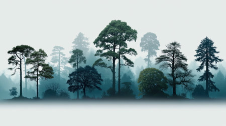 A Silhouettes of trees create serene and mystical forest scene