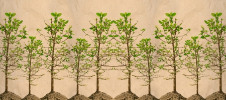 Vector graphic showing natural growth of trees, small to large, green leaves appearing at each stage