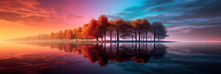 Conceptual 3D illustration of green, orange, yellow and brown trees in a row over water.