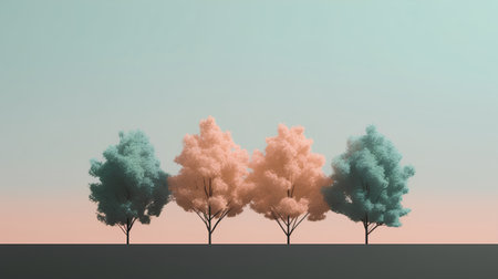 3D render of a row of trees in different shades of pink and blue