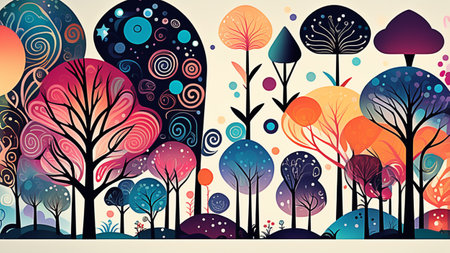 AI generated. Illustration. Colorful painted forest. Trees in forest. Background.