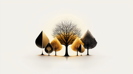 Modern tree silhouette logos arranged in geometric symmetry, neutral tones for professional visuals