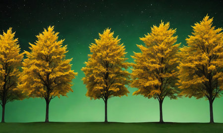 Golden Trees On A Green And Black Sky Background. Generative AI
