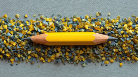A vibrant yellow pencil rests atop a bed of fine graphite and yellow wood shavings on a smooth gray background, ideal for art, education, and creative projects.