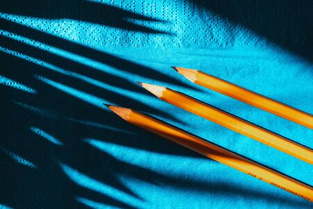 yellow graphite pencils on a blue background, top view. hard shadows