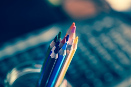 Close-up macro shot of sharpened colored pencils with blue, orange, and yellow tips. Selective focus on pencil leads. Art and school supplies concept. Back to school creative