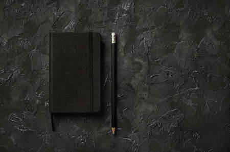 Photo of blank black notepad and pencil on black stone background. Copy space for text. flat lay.