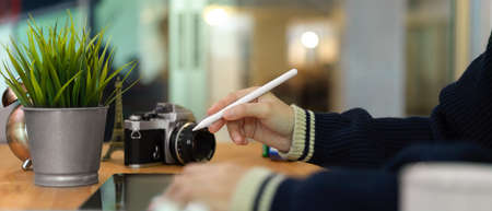 Close-up view of young male graphic designer editing their work with tablet in workplace